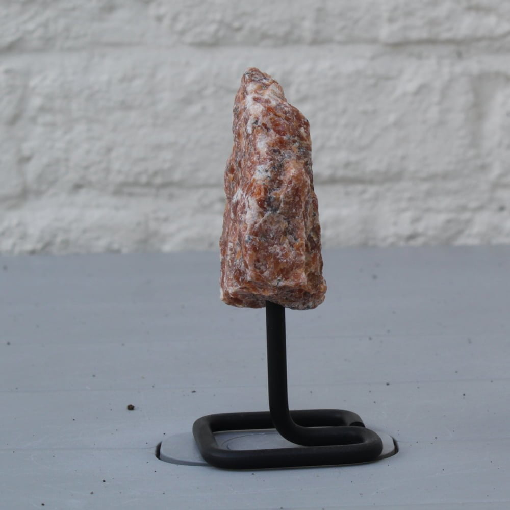 The sleek black metal stand adds a contemporary touch to the natural beauty of the calcite, creating a harmonious blend of modernity and sophistication.